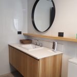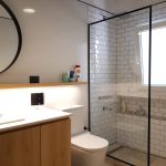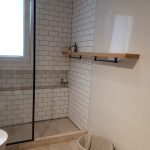 Este baño lleno de detalles es un mimo para una hija adolecente. La renovación permitió que tenga una mesada más amplia con mueble bajo mesada enchapado en madera natural que incluye un cajón profundo para la ropa sucia. La madera se repite en estantes lineales que sirven para apoyar cosas como para sostener los barrales toalleros, que a su vez integran los espacios. Tanto el piso general como el de la ducha son de mármol travertino con poro abierto, como el resto de la casa, pero aquí se lo colocó con piezas más grandes que lo hacen más contemporáneo. La ducha está delimitada del resto del baño por el revestimiento tipo subway y resalta el nicho lineal con tapa en travertino. El contraste de los colores claros está logrado a través de las vigas del techo en gris plomo y los accesorios varios en negro, como el marco del espejo, los artefactos de iluminación y demás.